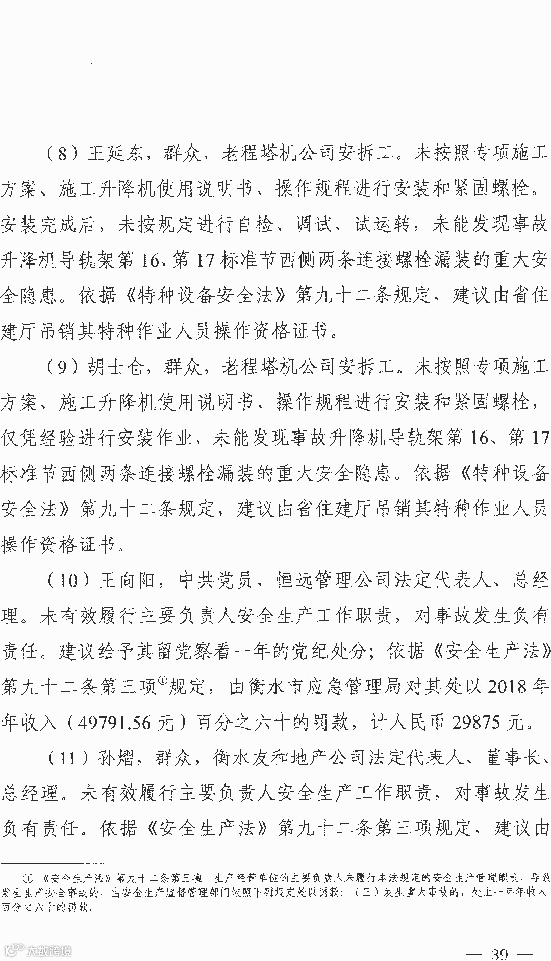 胡士仓,安拆工,建议吊销特种作业人员操作资格证书,已被检察机关批准逮捕。