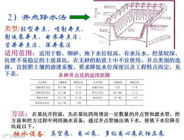②井管的成孔可根据土质分别用射水成孔、冲击钻机、旋转钻机及水压钻探机成孔。井点降水曲线至少应深于基底设计标高0.5m。