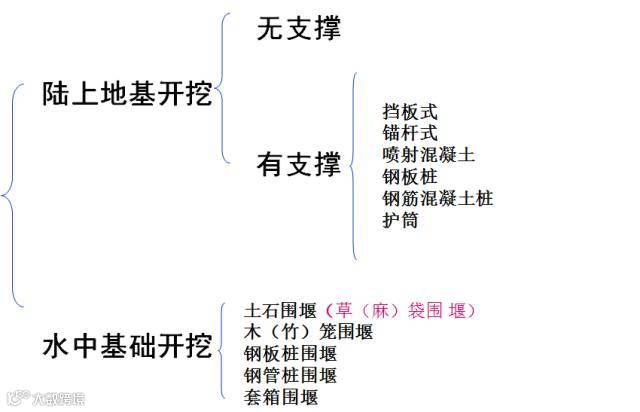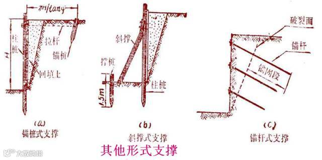 直衬板式、横衬板式坑壁支撑、框架式支撑、其他形式支撑(锚桩式、锚杆式、锚碇板式、斜撑式)。