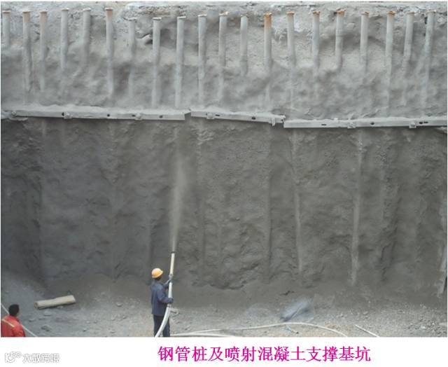 喷射混凝土及锚杆支护1)当基坑受条件的限制,开挖深度大,只能垂直或大坡度开挖,在地基土质较好、渗水量较小的情况下,可用喷射混凝土或锚杆(锚索)挂网喷射混凝土加固基坑坑壁,逐层开挖,逐层加固。2)当基坑为不稳定的强风化岩质地基或淤泥质粘土时,可用锚杆挂网喷射混凝土护坡。基坑开挖深度小于10m 的较完整风化基岩,可直接喷射素混凝土。