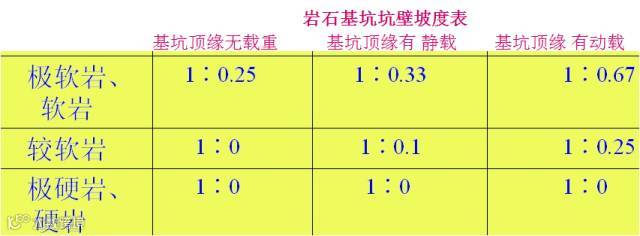 岩石地基开挖,坑壁坡度如表所述,硬质岩可以垂直向下,一般设计开挖深度为风化层厚度。新鲜基岩、微风化或弱风化岩层即可做基础持力层。开挖一般采用人工开挖,必要时可进行松动爆破,但要严格控制爆破深度和用药量,防止过量爆破引起持力层松动破坏。根据岩层的风化程度、节里、倾向及发育情况,采用适当方法进行坑壁防护。挖出渣石必须运至设计指定地点,不能对施工安全或周围群众生产、生活、环境造成危害。
