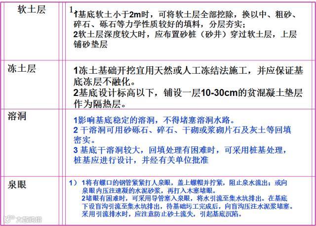 ⑥应避免超挖。如超挖,应将松动部分清除。机械开挖,应保留10cm—20cm厚底层,在浇筑前用人工挖至设计标高。