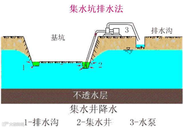 方法:基坑开挖中,在坑底基础范围之外设置集水坑并沿坑底周围开挖排水沟,使水流入集水坑内,排出坑外。