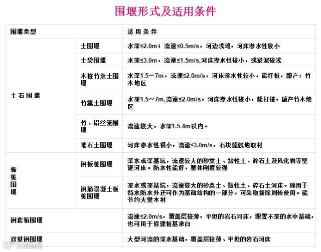 土、石围堰、草(麻)袋围堰、钢板桩围堰、钢筋混凝土板桩围堰、套箱围堰和木(竹)笼围堰。
