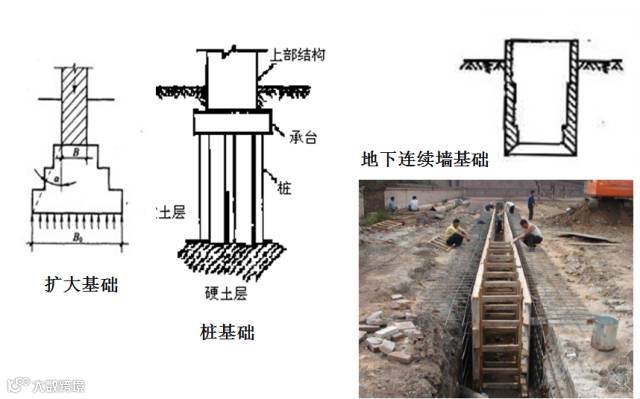 扩大基础、桩基础、管柱基础、沉井基础、地下连续墙基础。