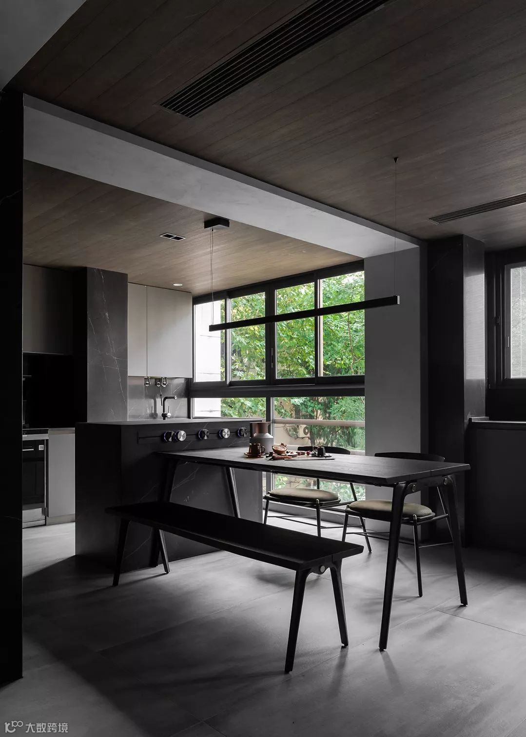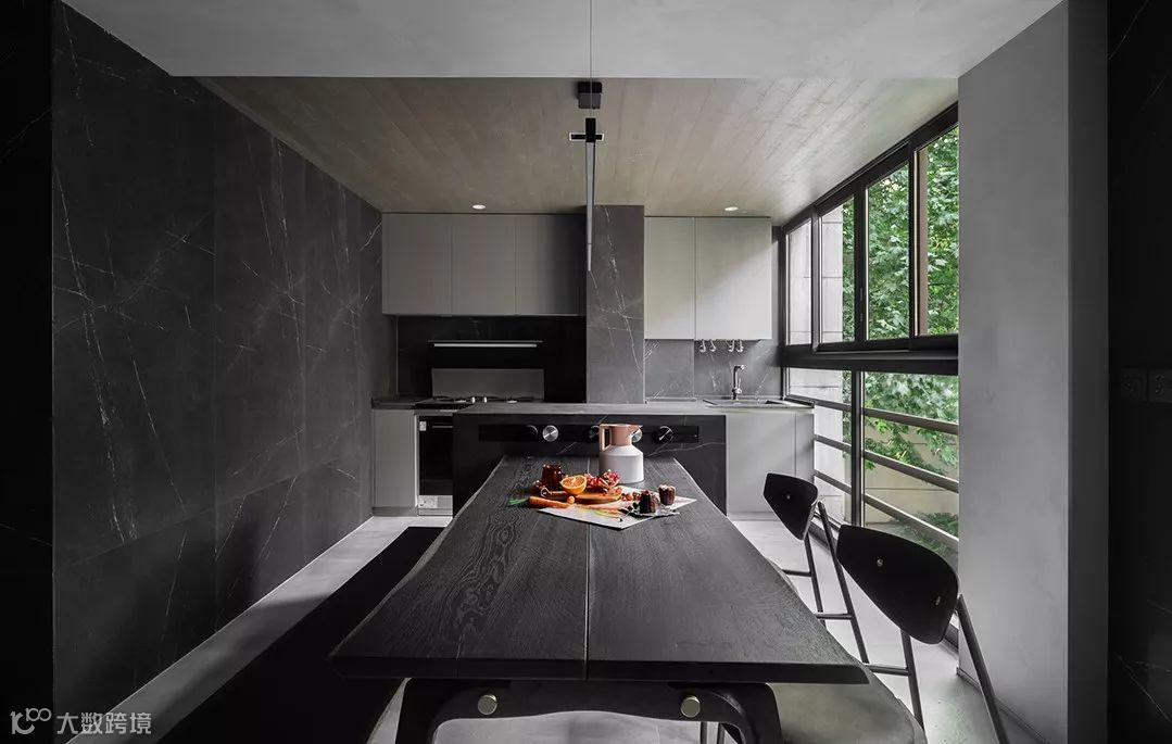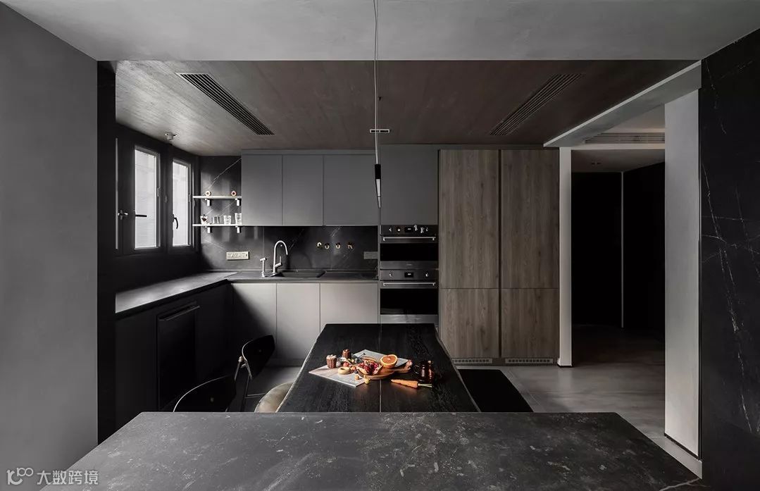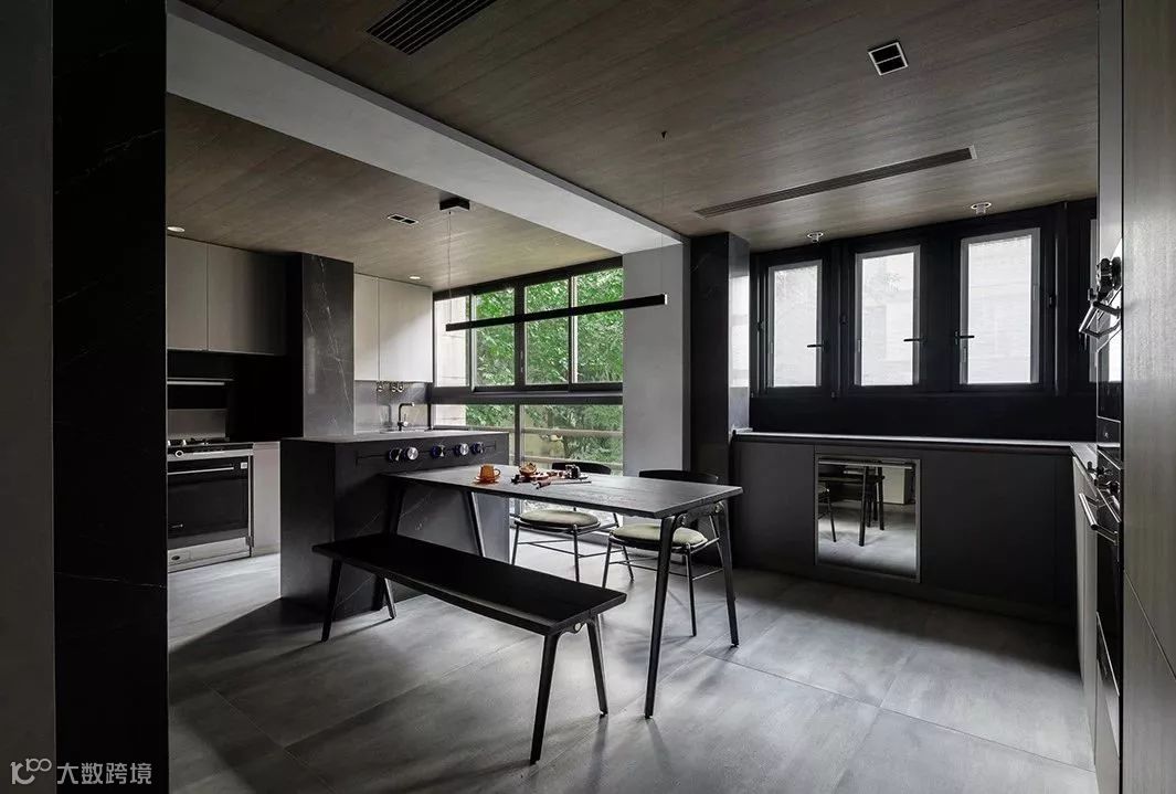 原结构厨房与餐厅中有一根30cm的梁,为了弱化这根梁,将梁与立面柱子的宽度延伸到45cm,厨房吊顶下沉260cm,中央空调下出下回,这个的办法让裸露的梁呈扁型存在厨房是敞开式的分为中厨和西厨,所有的设备都隐藏在柜子里,不占据台面空间,顶面的木饰面和墙面深色的岩板瓷砖,冷暖结合不显得单调。锅炉的位置在中靠近窗边的位置,用橱柜隐蔽掉杂乱的设备和水管。