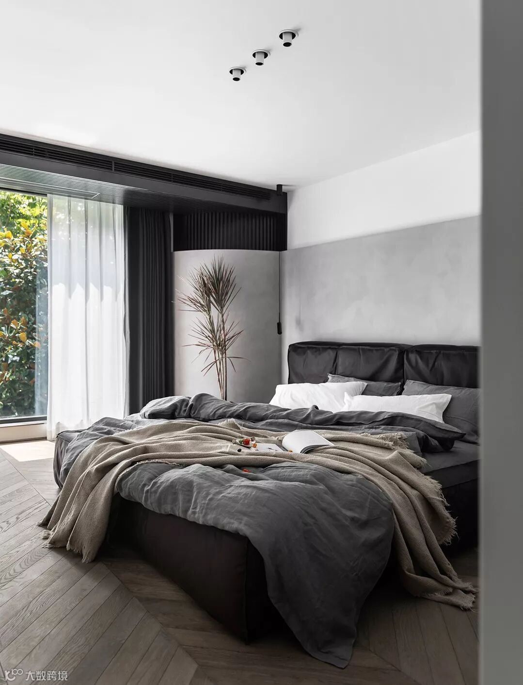 在拍这个案子的时候,我是主卧先拍的,因为早晨朝南的光线真是美丽。 主卧的外景也是被绿树环绕,原建筑靠近窗户的位置有一块90度的阳角,在设计前期就考虑到美观和安全程度,把这个角的粉刷层切除,设计了一个四分之一圆的角落,也成了造景的一部分,空调选择了侧出侧回的,一样的手法从墙面延伸到顶面,木饰面颜色1分光哑黑。