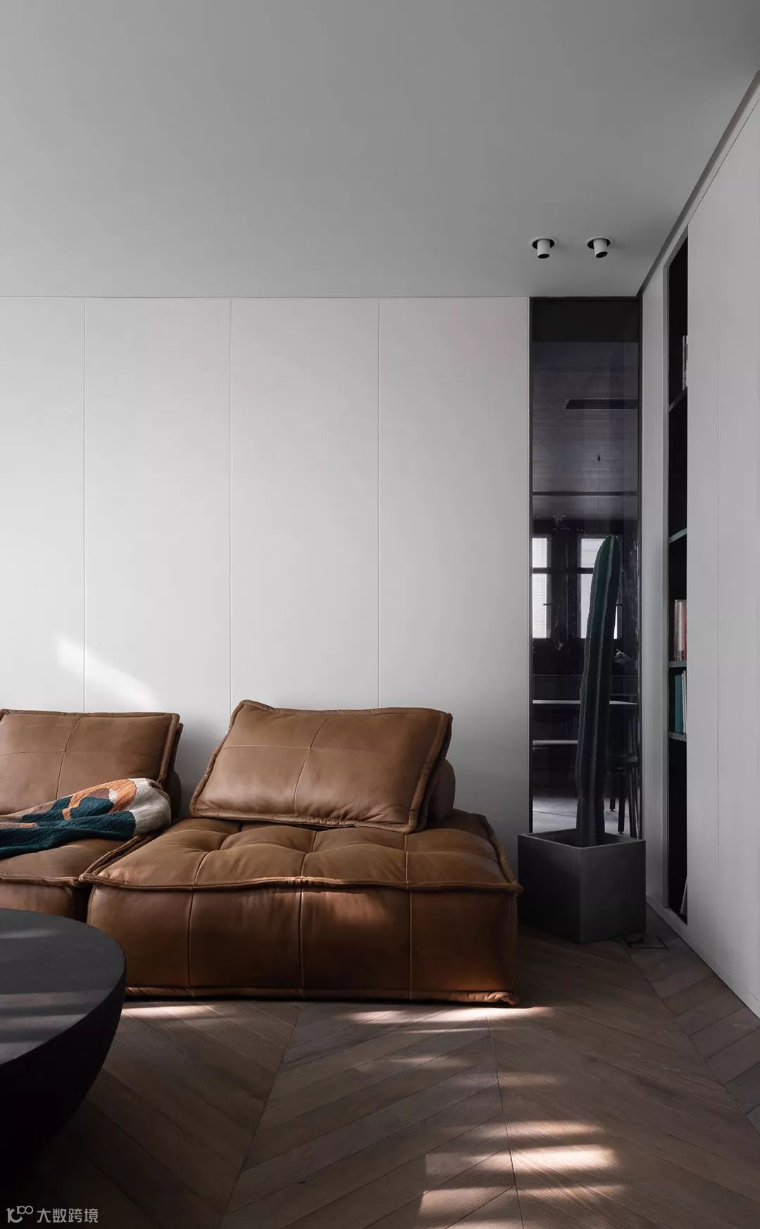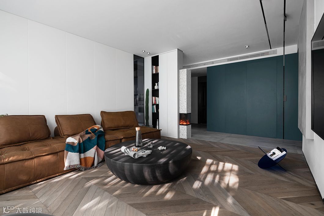 客厅沙发是由俩个方块组成(1.21+1.82)m。通过几何块的砌筑而成,随意拼合的单元式设计,整体造型介于沙发与卧榻之间,低矮的墩型。圆柱和长方体一体的靠背,通过调节彼此距离可以调节靠包角度,皮质上保留天然斑纹,和地面的木纹自然的光影相间。