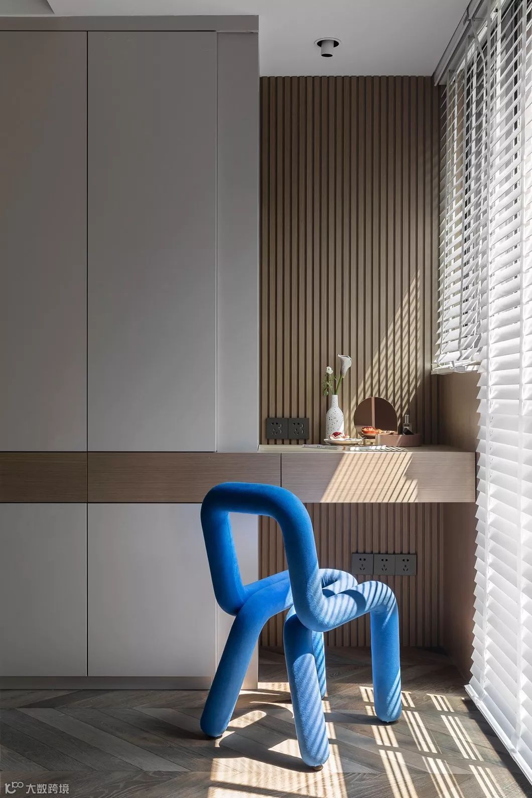 这个区域没有选择布帘,而是选择了木百叶,阳光晒进的时候是整齐的光影,也是大自然给的线条。背面的条形木饰面与主卧靠近窗边的木饰面有对应的空间连接。女孩入境的侧脸,看不清的眼神真的很爱。