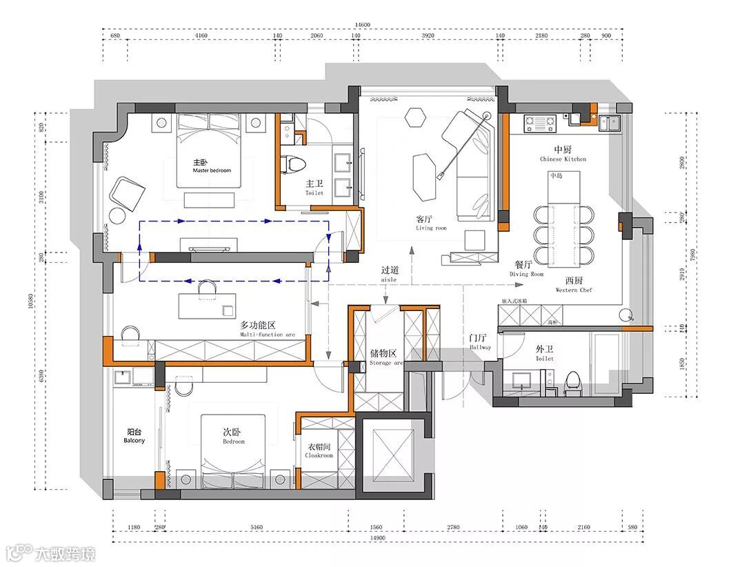 三卧朝南有很好的采光,但在格局上形成了主卧和多功能室可合可分的形态,多功能室可以做为独立的书房或者衣帽间梳妆区,也跟主卧互通关系形成圈型走线。