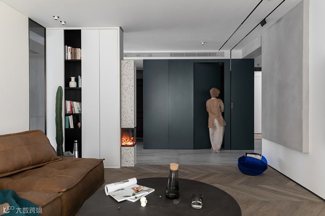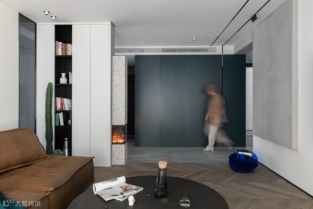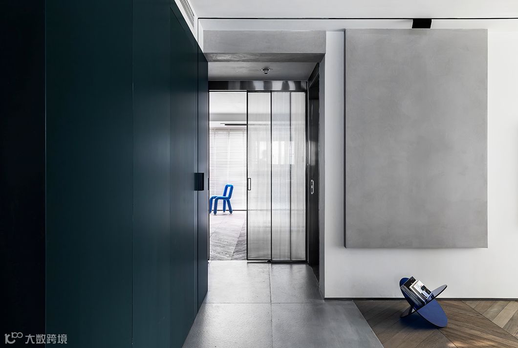 从餐厅朝向过道,灰玻的背面更能感受到在厨房餐厅和客厅的互动。