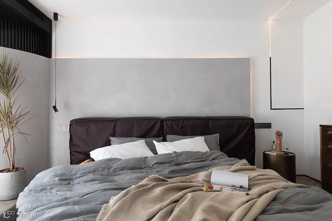 床头靠近又面的位置是男孩的位置,从墙面到顶面的线形灯,只有他的位置能控制,专属他的氛围灯,可以随意调节,取下或者滑动。
