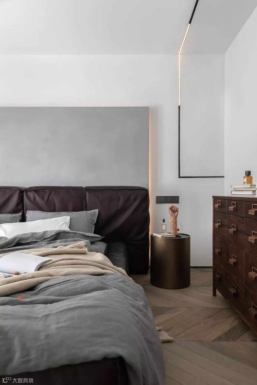 窗靠背的造型是顺势再包一圈圆柱体。床的选择很重要,提前在做水电时就能把家居选好最佳,因为这张床的靠背有2.65m,还是移动了插座的位置。床是头层复古牛皮手工制作,和沙发一样有缝线的细节。