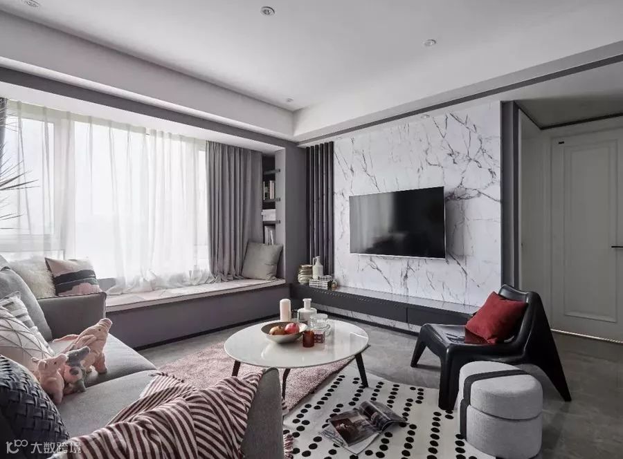 电视背景墙处是做了大理石的设计,让客厅看起来更为大气。客厅边上的飘窗利用侧方来做收纳,方便躺在飘窗上晒着太阳、看看书。