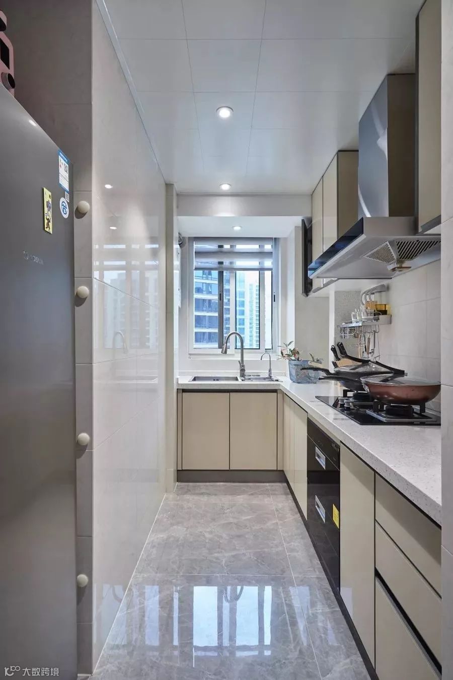 厨房是个狭长的空间,设计师选择了布置L型的橱柜,动线更为合理。地面铺贴的灰色调的抛光砖搭配墙面的素色墙砖和橱柜,让厨房看起来更为简洁大方。