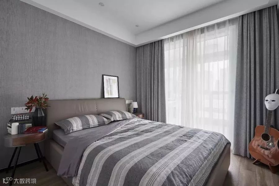 次卧在设计上会更为简洁一些,床头背景墙直接铺贴灰色系的墙纸,灰白相间的条纹床品给次卧带来一些年轻感,显得更为轻松、舒适。