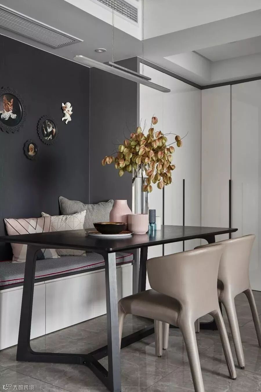卡座式的餐桌和柜子连在一起,L型的到顶柜子能够满足更多的收纳需求。卡座的上方还做了瓷盘装饰,搭配精致的餐桌摆设,显得更为美观。