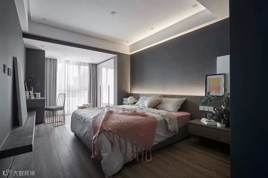 主卧室同样是一灰色调作为主色,在床头靠背的后方加入了藏光,把阳台和主卧结合起来,显得更为宽敞,又能增强卧室的收纳能力。