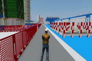 由于项目红线内可利用场地有限,平面布置及交通组织是施工难点 。因此,项目根据各施工阶段的特点和公司场地布置的标准化要求,依据总平面布置图分阶段进行三维场地布置模拟,通过BIM可视化模型在场地进行漫游,模拟车辆运行路线,动态调整,为各分包单位划定交通路线以及施工场地,从而保证场地的利用率。