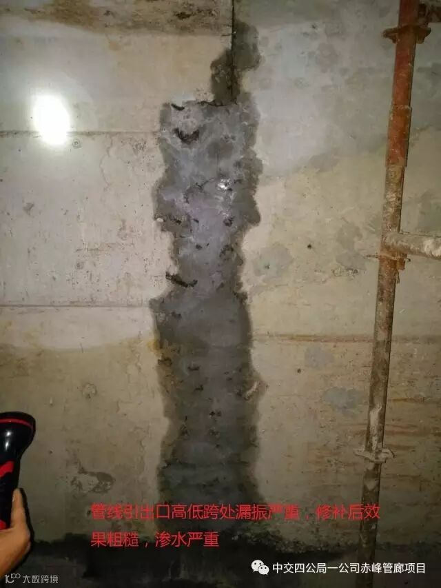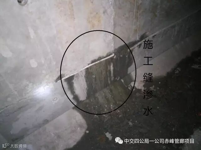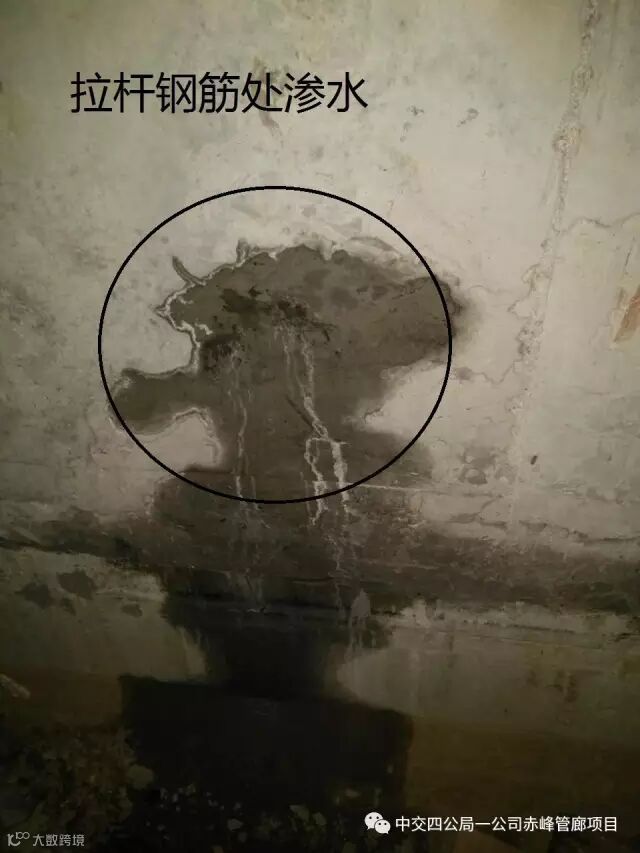 )拉杆钢筋处裂缝渗水,施工中拉杆钢筋必须使用止水拉栓,严禁搭接结构钢筋,防止通过拉筋向管廊渗水。