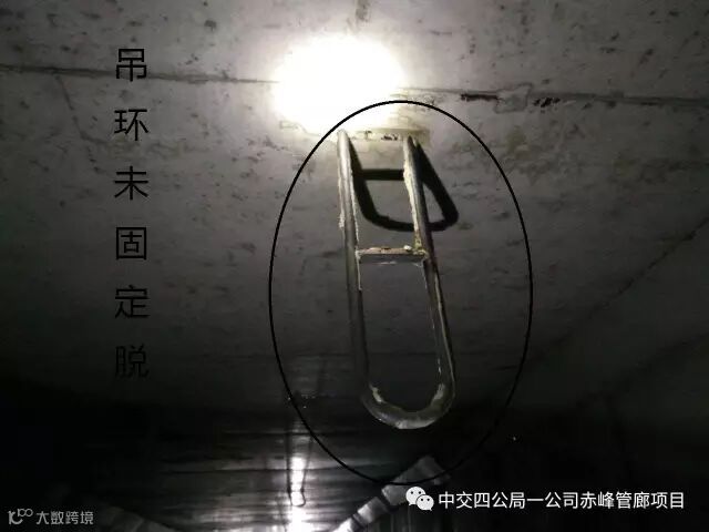 )吊环倾斜、预留尺寸不一。主要原因是吊环未固定,浇筑造成破会。最好点焊加固。