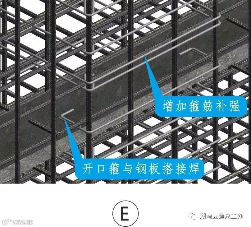 E.被断开的柱箍另设同直径钢筋与钢板搭接焊5d,但不得烧伤钢板;钢板上下各加一道原柱箍,与原箍筋间距不小于50mm。