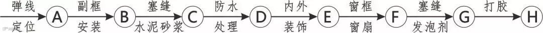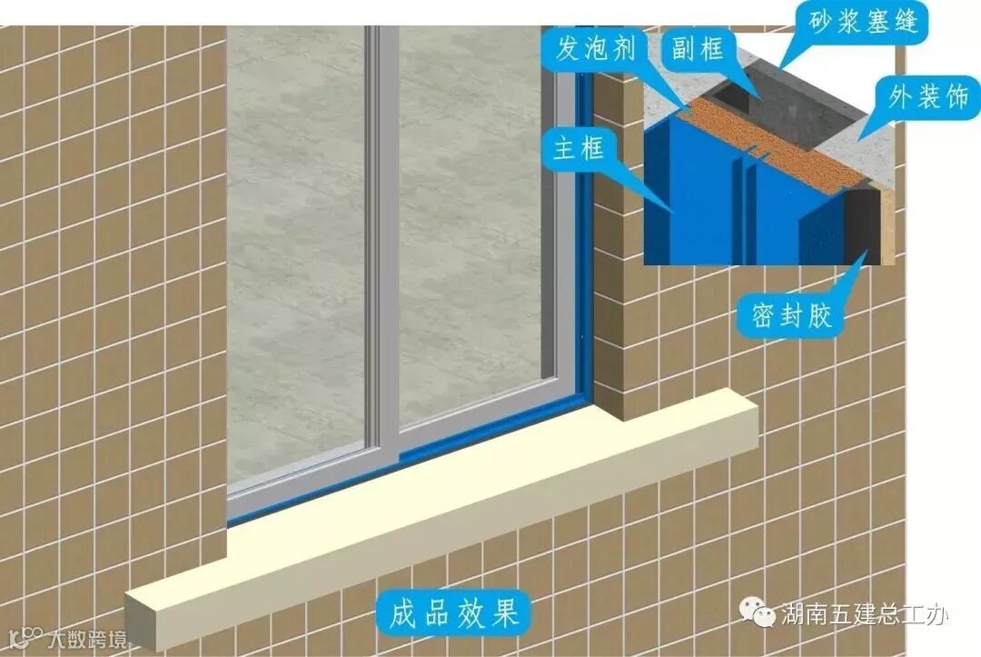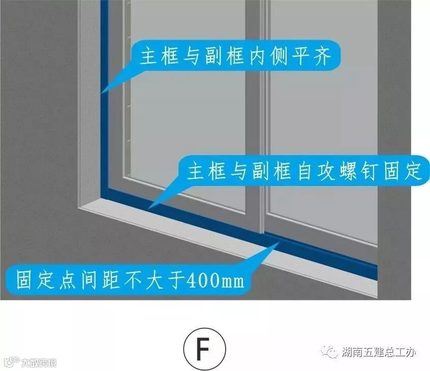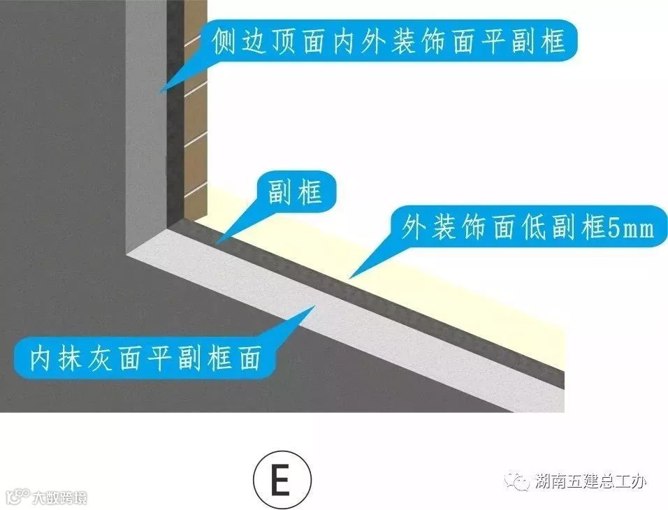 E.内装饰抹灰面平副框内侧面,外装饰面平副框顶面、侧面,外装饰窗台面比副框底5mm,内外装饰施工时应及时清理受污副框。