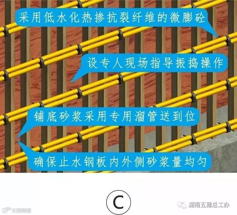 C.施工缝部位预浇20-40mm同砼配合比水泥砂浆,之后分层(不大于500mm)浇筑,各层在初凝前完成上层砼浇筑,避免施工冷缝。