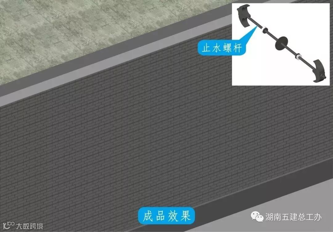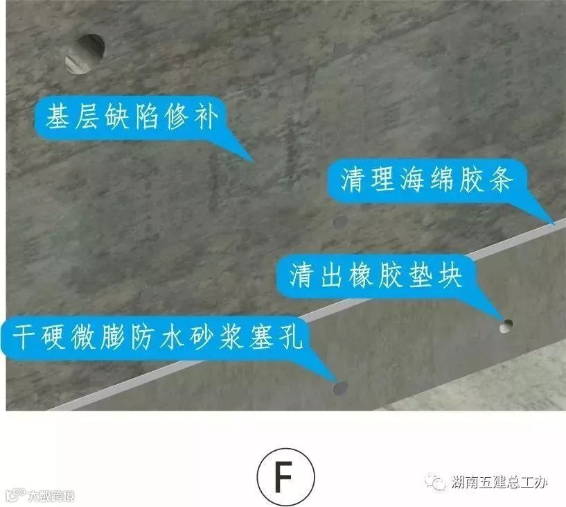 F.清理出止水螺杆橡胶垫,沿孔内割断外露螺杆,不得用手工折断;将干硬微膨防水砂浆压入螺杆喇叭孔后铁抹压平。