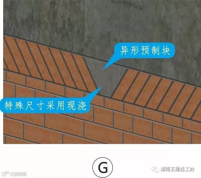 H.斜砖统一由工厂定制,不得由现场切割而成,从而影响尺寸准确性和恶化施工环境;组砌砼块尽量预制化,以免影响进度。