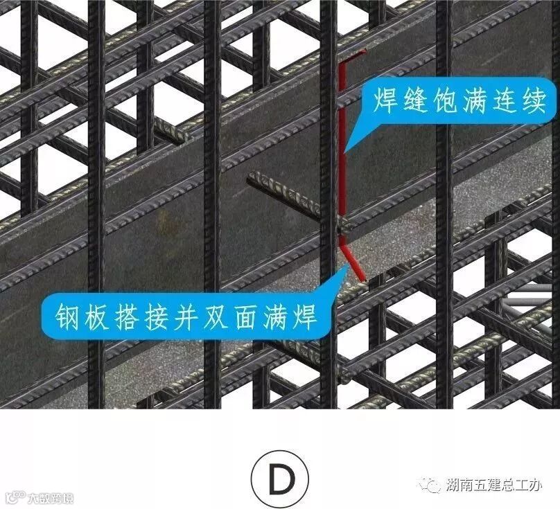 D.钢板搭接不小于20mm,双面满焊,各面第一遍从中至上从下至中,第二遍从下至上,焊缝高度5mm;转角采用成品整折板。