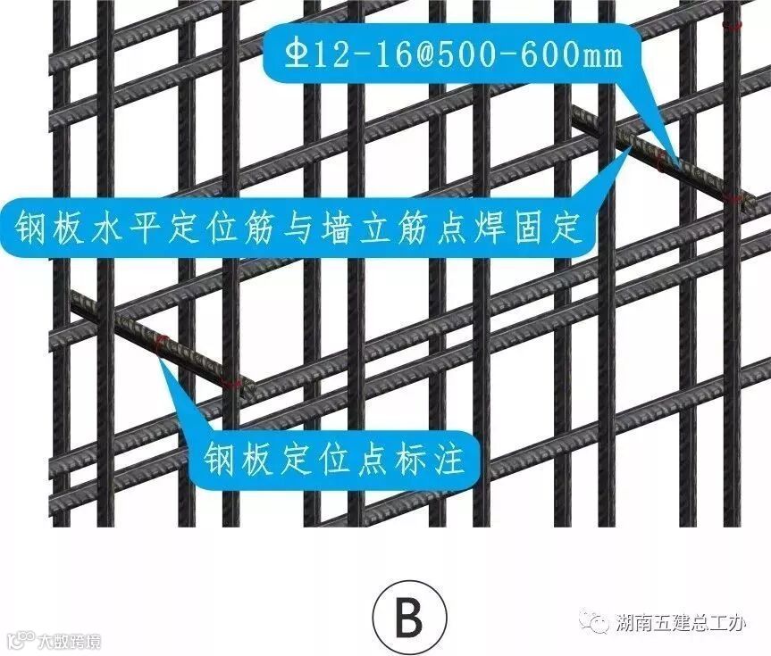 C.钢板就位调整好垂直度后将下口点焊在水平定位筋,并将中部限位筋(原已焊牢在钢板上)与外墙立筋点焊牢固。