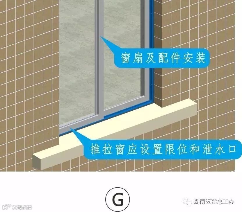 F.窗台向外坡度不小于10%且不小于25mm,外墙装饰面压窗框3-5mm,窗框边与外装饰留凹槽深宽均5-8mm,用密封胶填充。