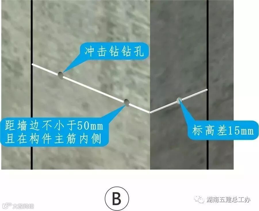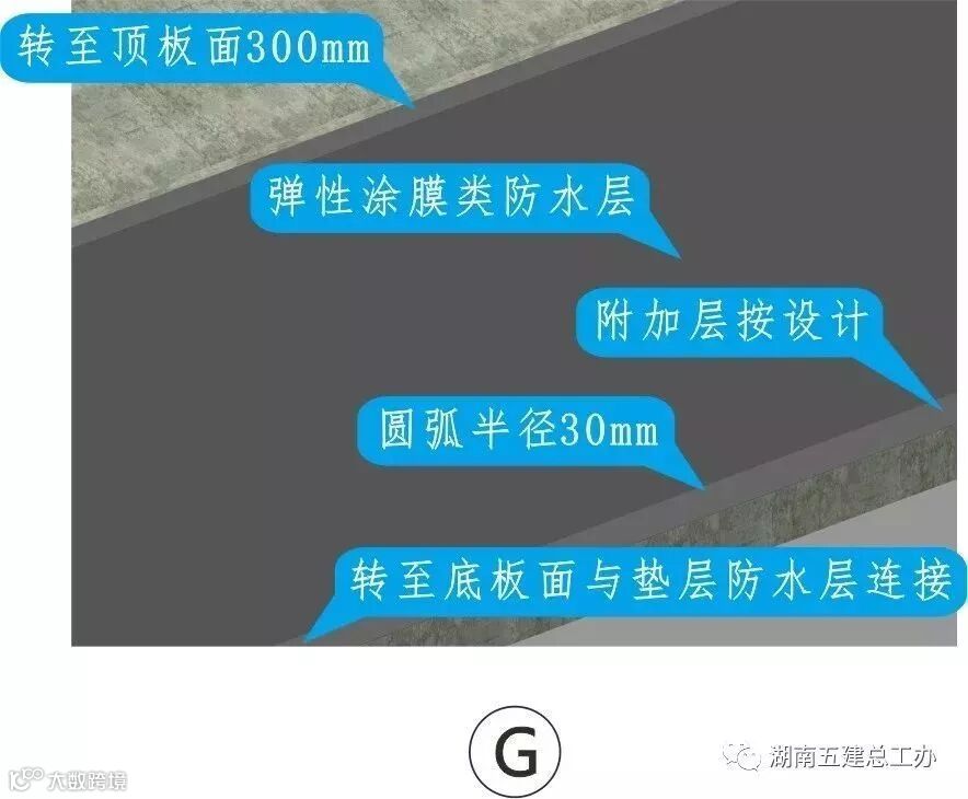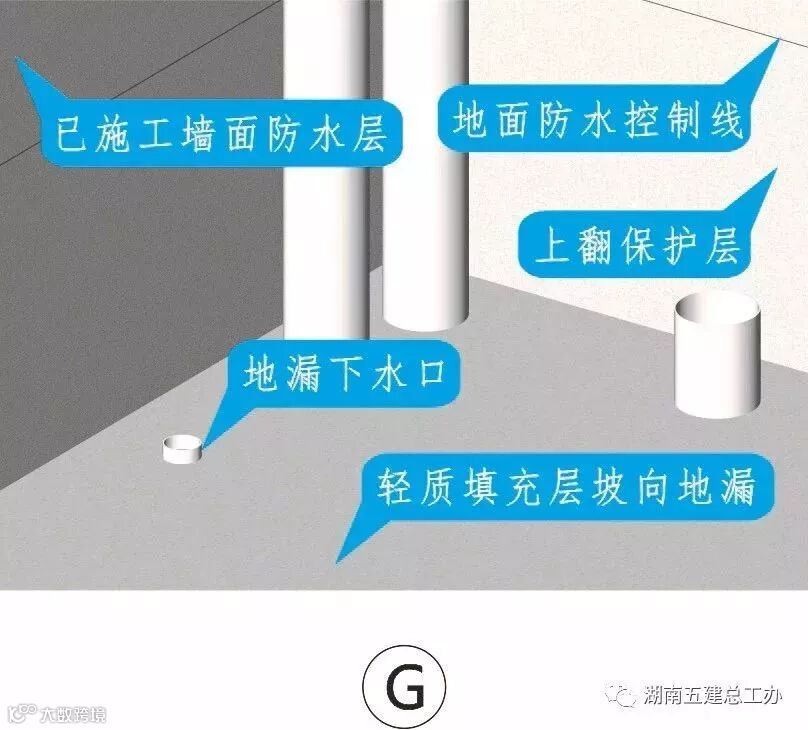 F.蓄水试验通过后立即施工楼地面和墙面保护层,墙面保护层接至墙面防水层,为防开裂可在墙保护层中设置耐碱网格布加强。