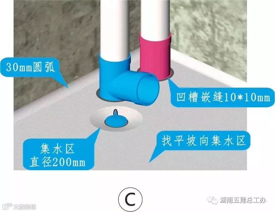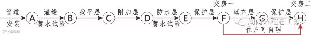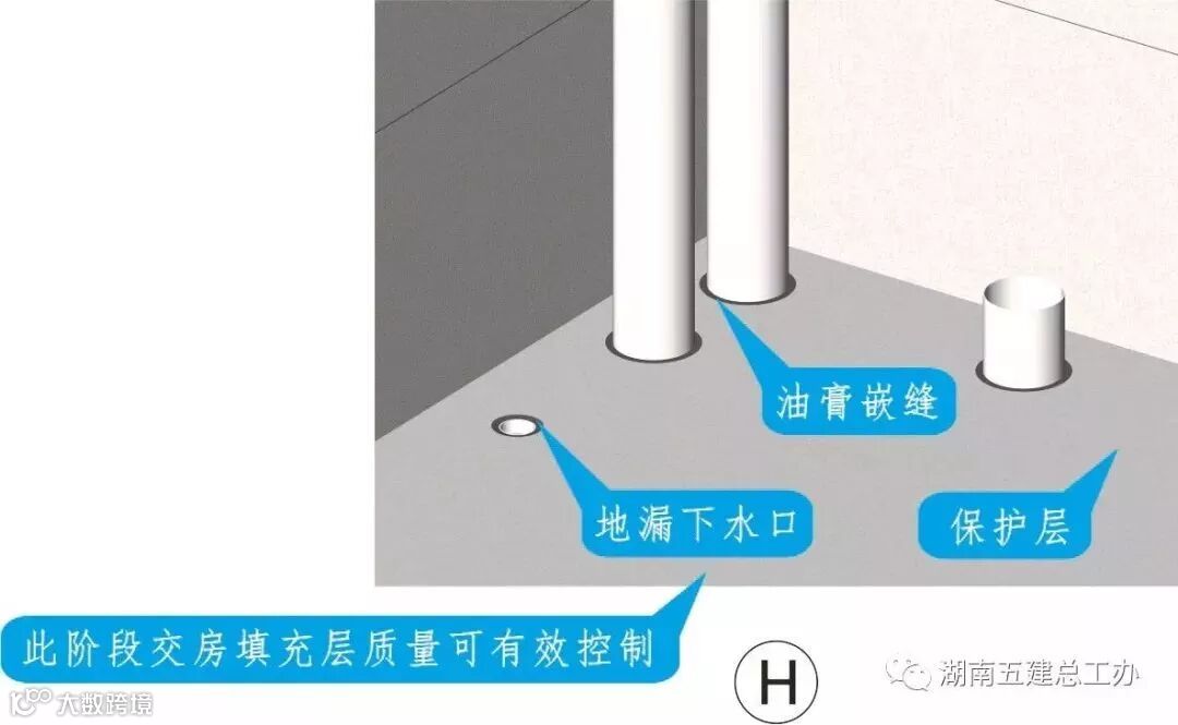 H.管周留凹槽嵌防水油膏,住户施工楼地面装饰面层前,需在保护层上再做涂膜防水层一遍,与土建防水形成复合防水层。