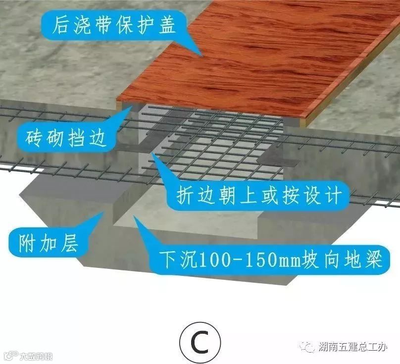 C.后浇带冲洗干净后及时喷洒阻锈剂防止钢筋锈蚀;并及时砌筑水泥标准砖挡边,外用木枋钉九夹板覆盖。