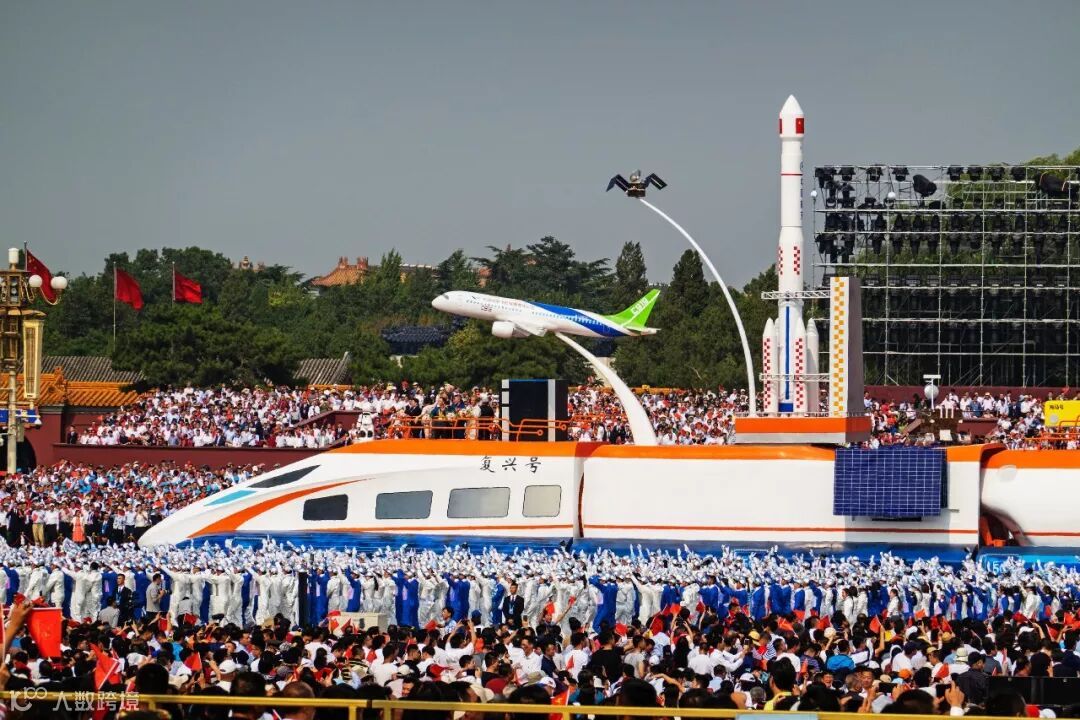 2019年10月1日,在庆祝新中国成立70周年阅兵仪式上,高铁、天宫、蛟龙三辆彩车搭载着大国重器,行进在天安门广场时首尾相接,组成一列高速飞驰的“复兴号”,驶向更加美好的明天。