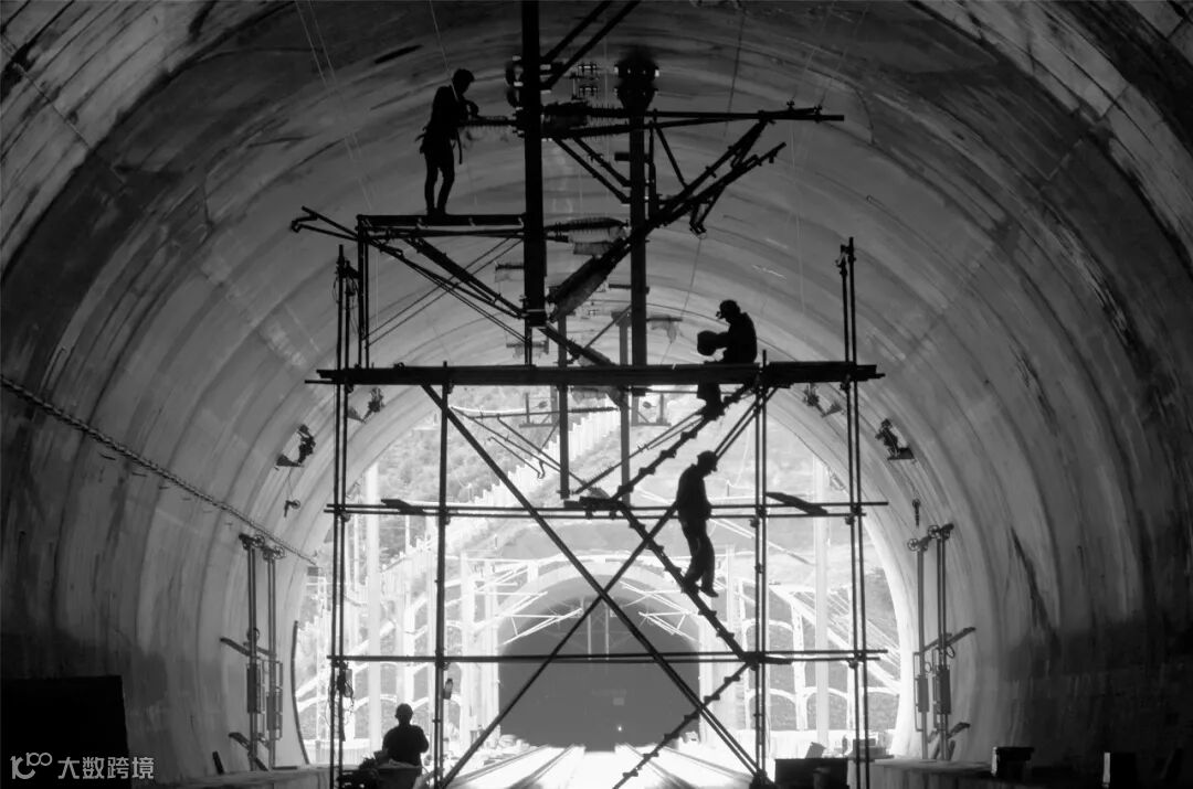2018年5月8日,拍摄于杭(州)黄(山)高铁,施工作业人员在竹坑钨隧道中搭建起的脚手架上,在隧道里交叉作业的工作场景,透过隧道区间中的光影,建设者们施工步频仿佛就像美丽的舞者跳跃的音符一样。