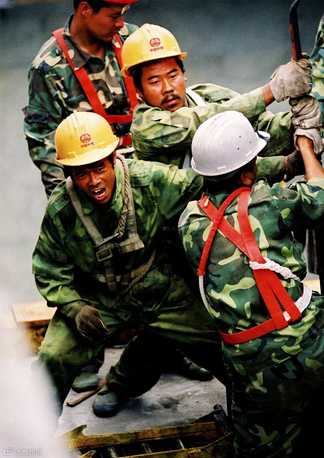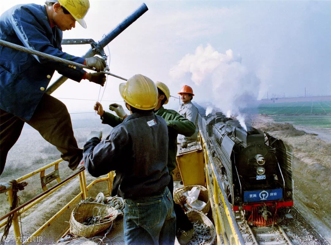 2003年7月,拍摄于成都铁路枢纽工程架梁现场,中铁二局新运公司几位建设者正在繁忙的作业场景。特别是面对我们这位精神抖擞喊着号子的工人表情十分丰富,和右上部几双紧握钢扦的手构成了一幅动态自然、生动感人、主题突出的新时代铁路建设者形象。