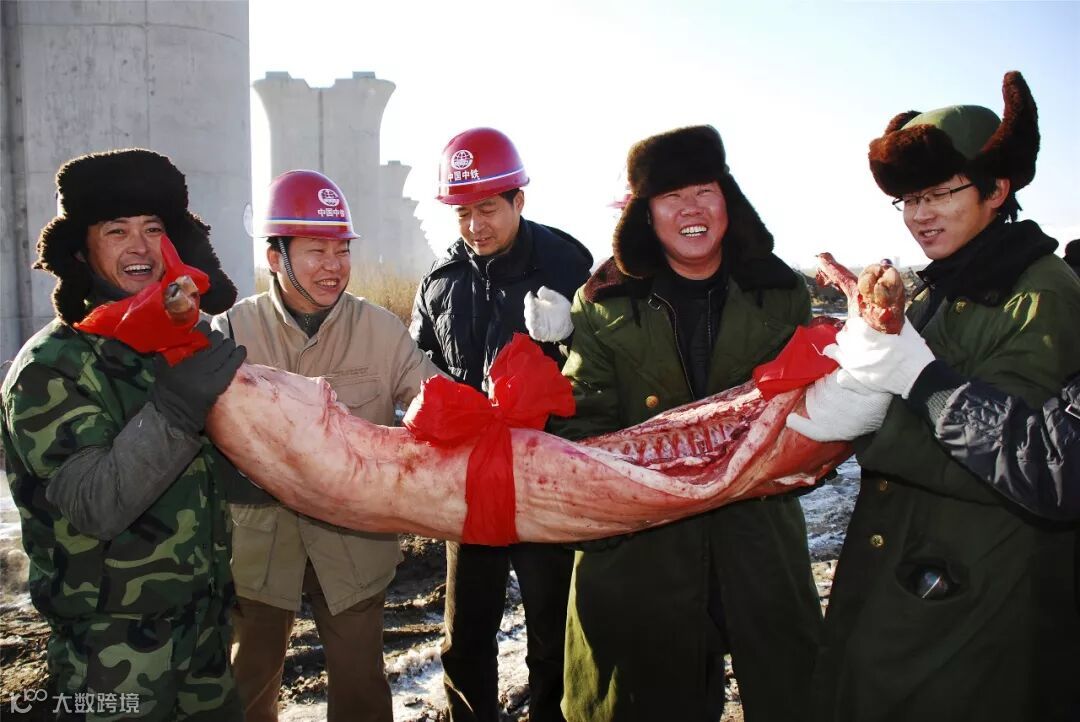 2009年12月12日,拍摄于中铁二局哈大铁路客运专线海鞍特大桥工地。东北大地白雪皑皑,寒风刺骨,中铁二局新运公司哈大客专工程大队员工不畏严寒,坚守在工地进行架梁施工,保工程进度。该公司工会主席关心一线员工的生活,开展冬送温暖活动,将新鲜猪肉等慰问品送到工地慰问员工。