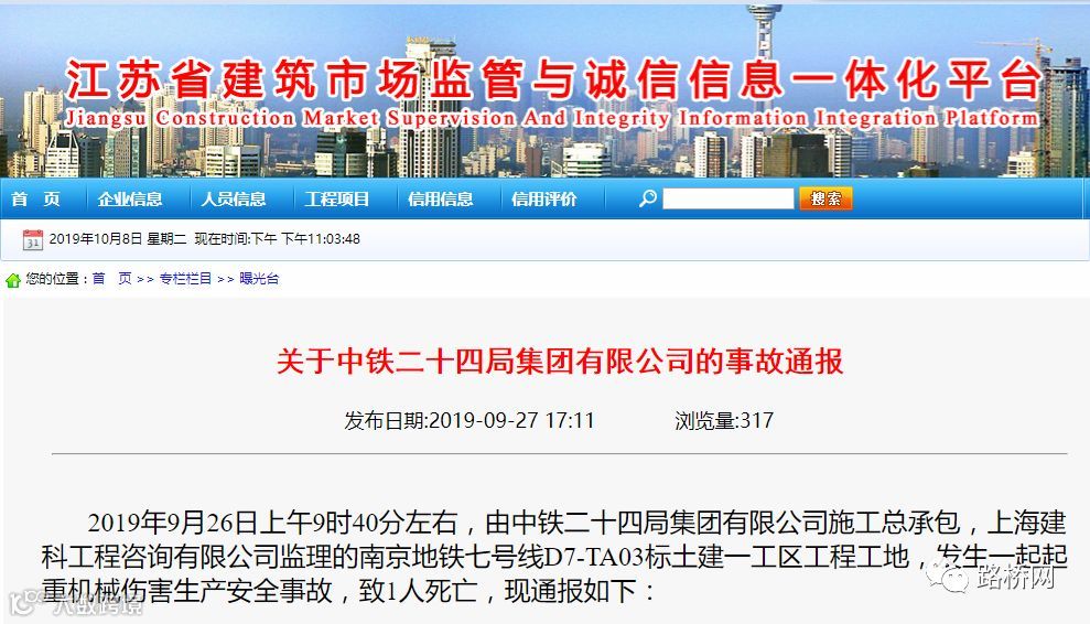 江苏省住建厅曝光通报称, 2019年9月26日上午9时40分左右,由中铁二十四局集团有限公司施工总承包,上海建科工程咨询有限公司监理的南京地铁七号线D7-TA03标土建一工区工程工地,发生一起起重机械伤害生产安全事故,致1人死亡,现通报如下:
