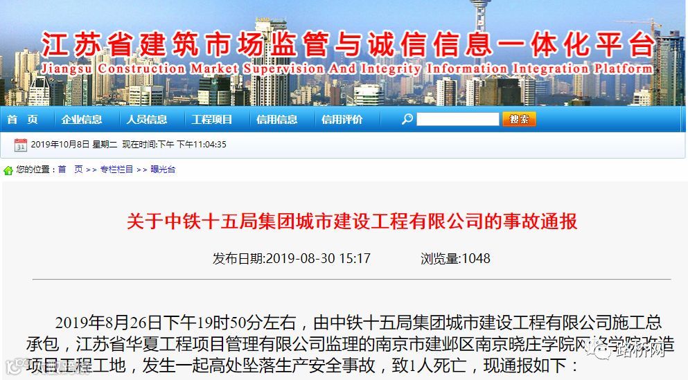 8月26日19时50分左右,由中铁十五局集团城市建设工程有限公司施工总承包,江苏省华夏工程项目管理有限公司监理的,南京市建邺区南京晓庄学院网格学院改造项目工程工地,发生一起高处坠落生产安全事故,致1人死亡,施工总承包单位被江苏省住建厅通报,并按照有关规定自8月30日发布之日起在江苏省内不得承揽新的工程项目。