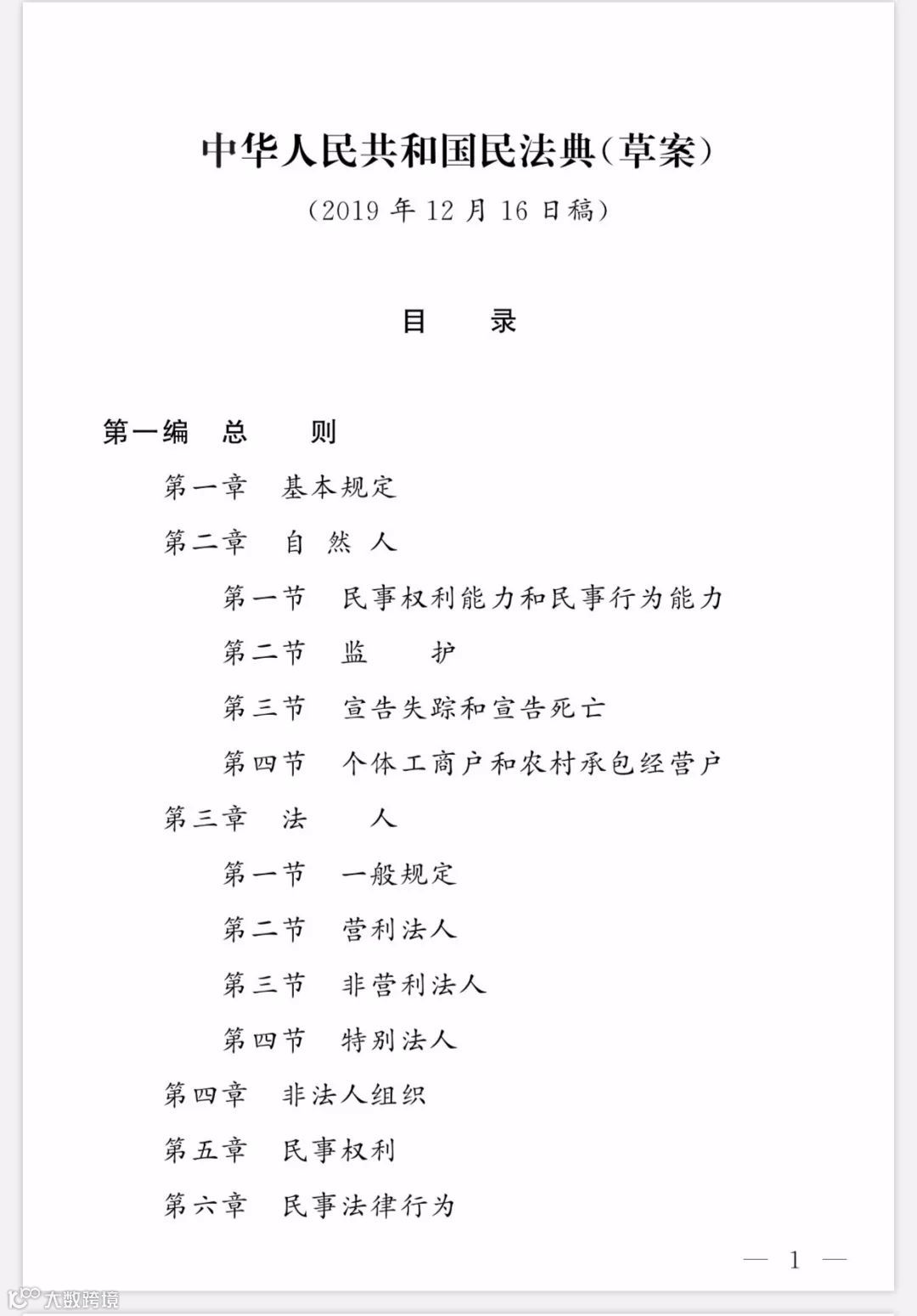 这是自2014年提出“编纂民法典”的目标以来,立法机关首次以连续条文编号的形式,公布民法典草案。该草案包括总则、物权、合同、人格权、婚姻家庭、继承、侵权责任七编。