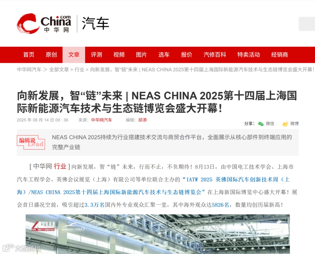 NEAS CHINA 2025同期邀请到了中国汽车报、中华网、盖世汽车、环球汽车网、AI汽车制造业等多家行业权威媒体对此次展会进行报道。