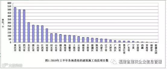 从各地查处的违法工程项目数量看,重庆、江苏、四川3省(市)查处力度较大,分别查处项目535个、500个、496个(见图1)。