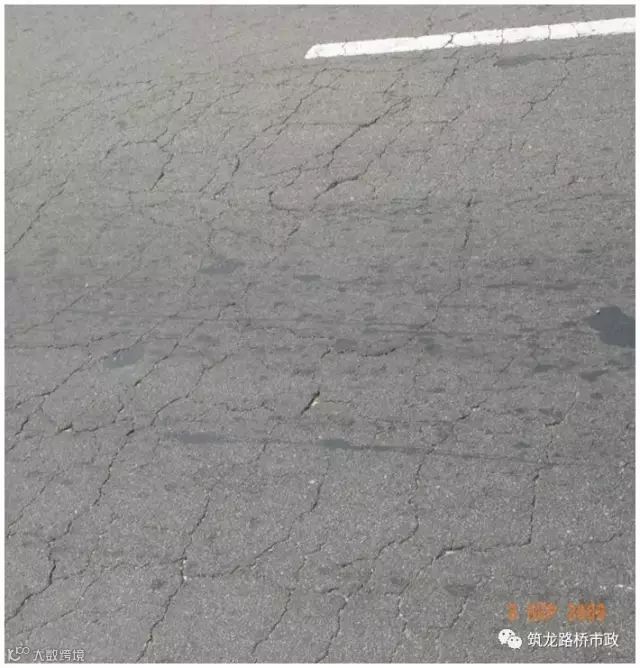 网裂是相互交错的疲劳裂缝, 它的初始形态是沿轮迹带出现单条或多条平行的纵缝,而后,在纵缝间出现横向和斜向连接缝,形成缝网。