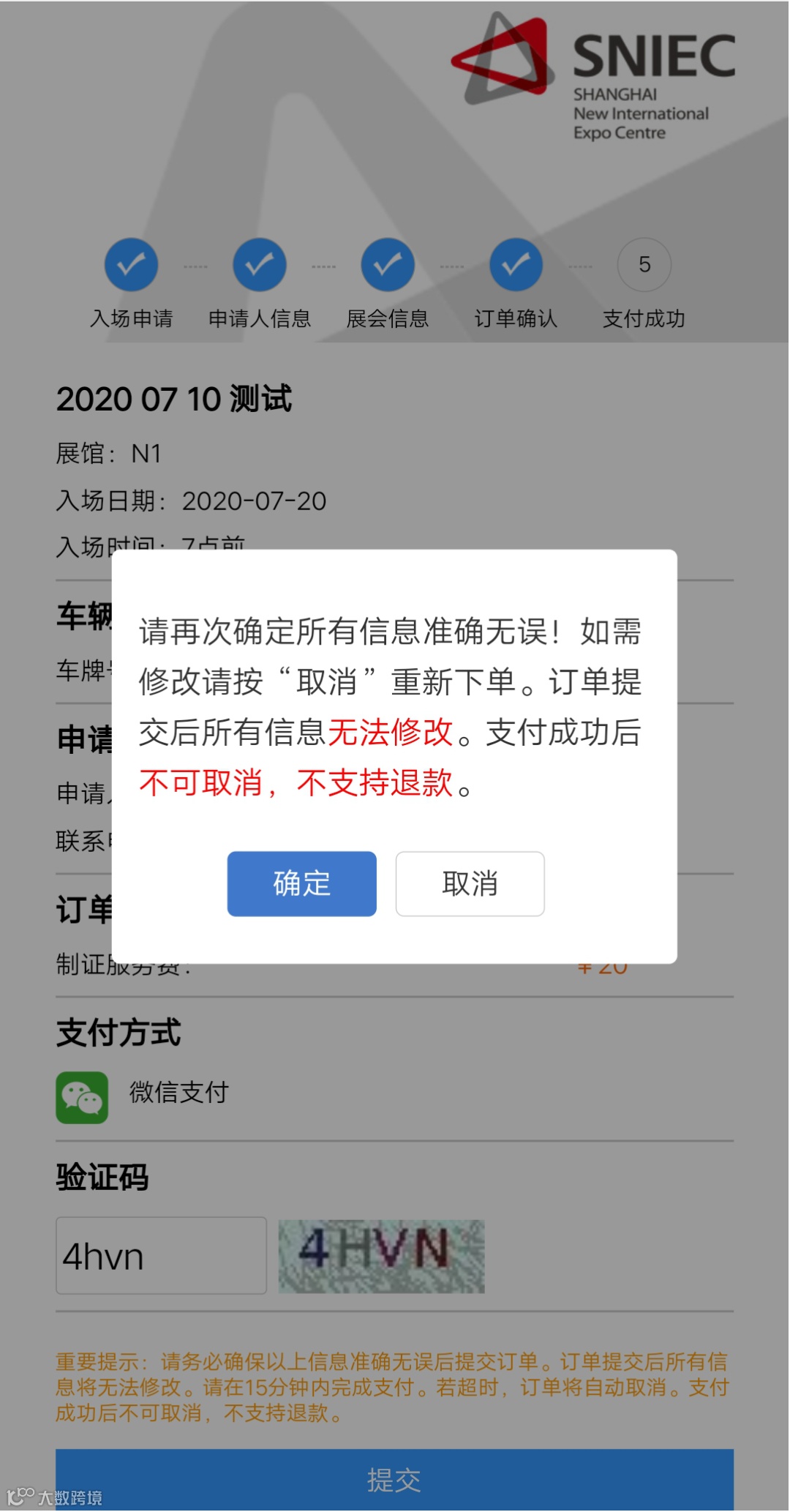 如发现填写信息错误,请立即取消支付并退出系统,重新登录后进行申请。付费后不可修改信息,无法办理退款和取消订单,请务必谨慎下单,确保手机号与车牌号、展会、展馆和进场时间选择准确无误。