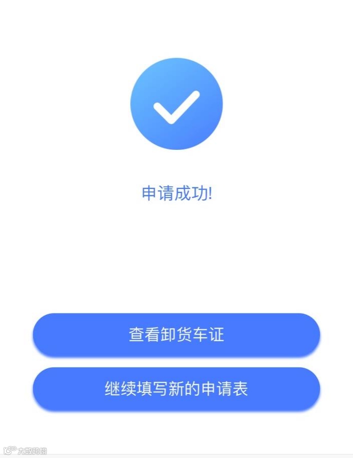 申请成功页面,可点击“查看卸货车证”,或者点击“继续填写新的申请表”,填写其它车辆的信息,进行申请