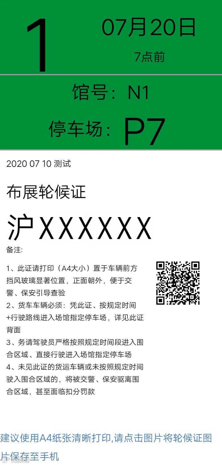 支付成功后,保存轮候证的正反面图片,由办证人员自行打印《轮候证》(A4纸大小,彩色、黑白均可使用) 放置在车辆前挡风玻璃显著位置处,供交警和保安识别;未办理《轮候证》的货运车辆将无法进入展馆指定停车场。