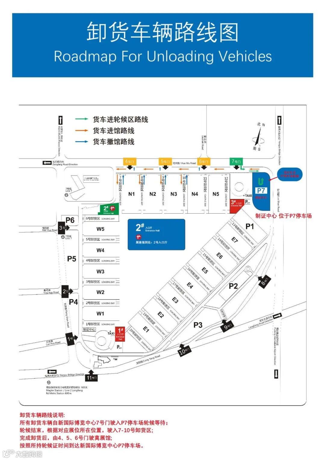 货车必须按照轮候证上的时间到达,货车到达后持《轮候证》前往相应停车场验证,再凭《卸货区车证》,听从现场保安人员指挥,分别从7-10号卸货区通道进入内广场区域装卸货。